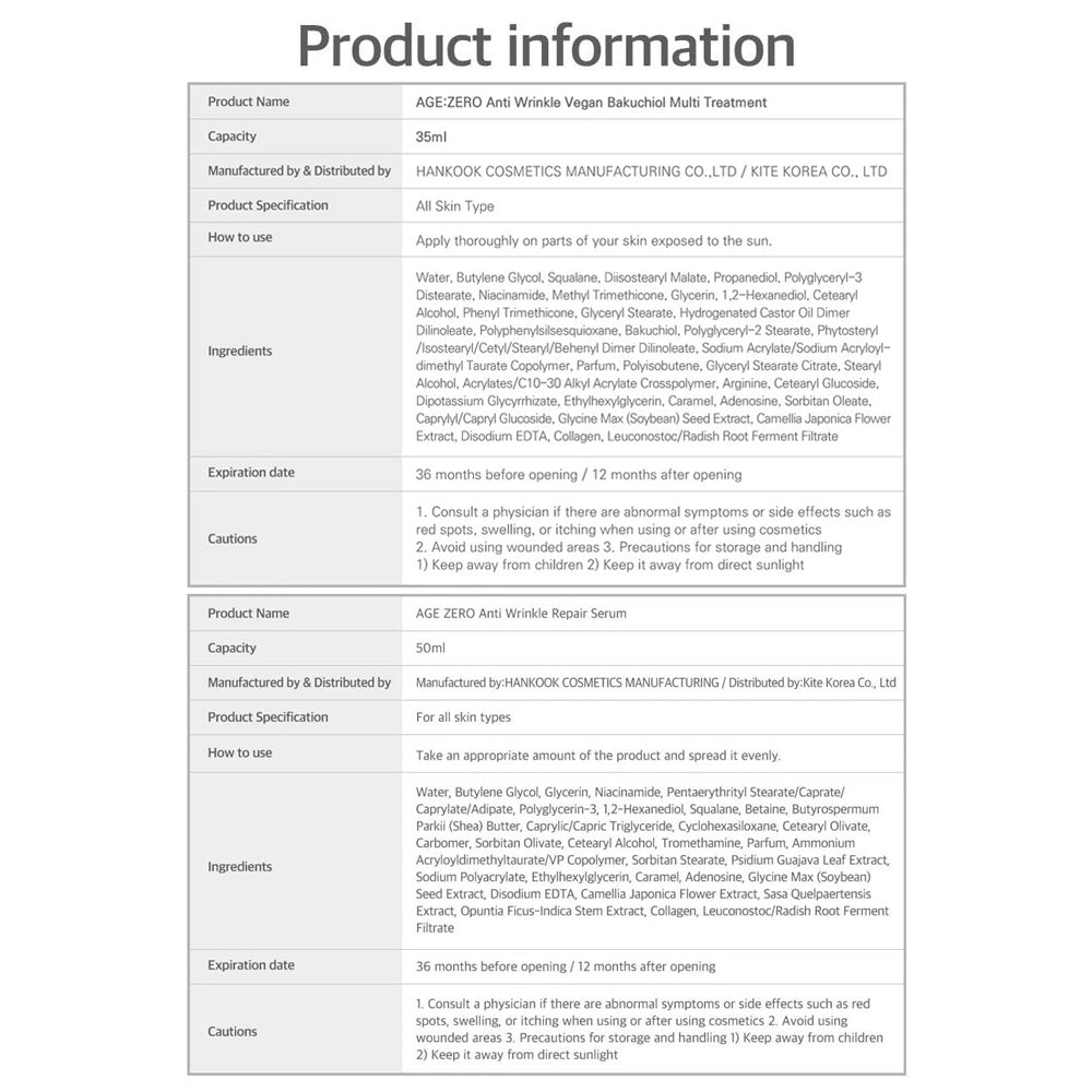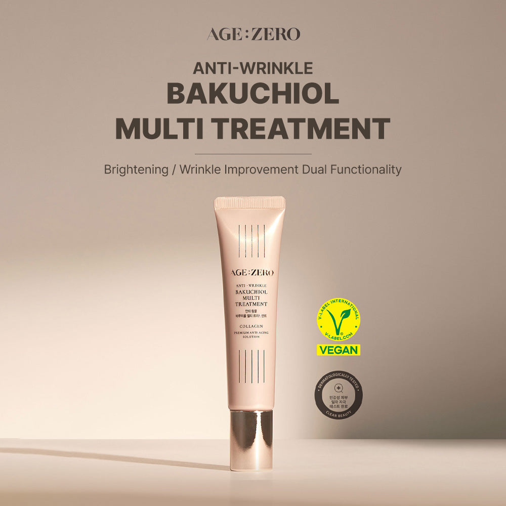 Revitalize and transform your skin with the AGE:ZERO Anti Wrinkle Repair Serum Treatment Kit, a vegan K-Beauty solution designed for anti-aging, hydration, and radiance. This complete kit includes a 50ml serum formulated with retinol, niacinamide, and hydrolyzed collagen to deeply hydrate, improve skin elasticity, and support brightening, and a 25ml treatment enriched with bakuchiol, serving as a multi-spot and eye cream for targeted firming, wrinkle improvement, and radiance enhancement. Both formulas are lightweight, non-sticky, and absorb quickly for a comfortable daily skincare routine.