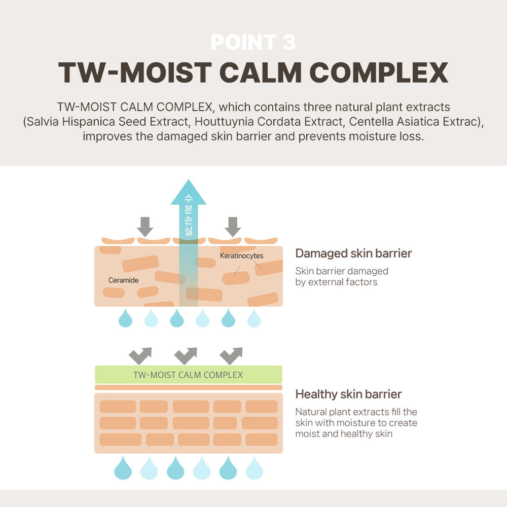 Ideal for dry and dull skin, the serum and treatment work together to strengthen the skin barrier while delivering a soothing TW-Moist Calm Complex. Apply daily on your face, neck, and delicate areas for hydration, elasticity, and wrinkle care. Dermatologically tested for safe and gentle care, these high-concentration formulas allow you to enjoy the benefits of Korean skincare science in a luxurious and effective routine.